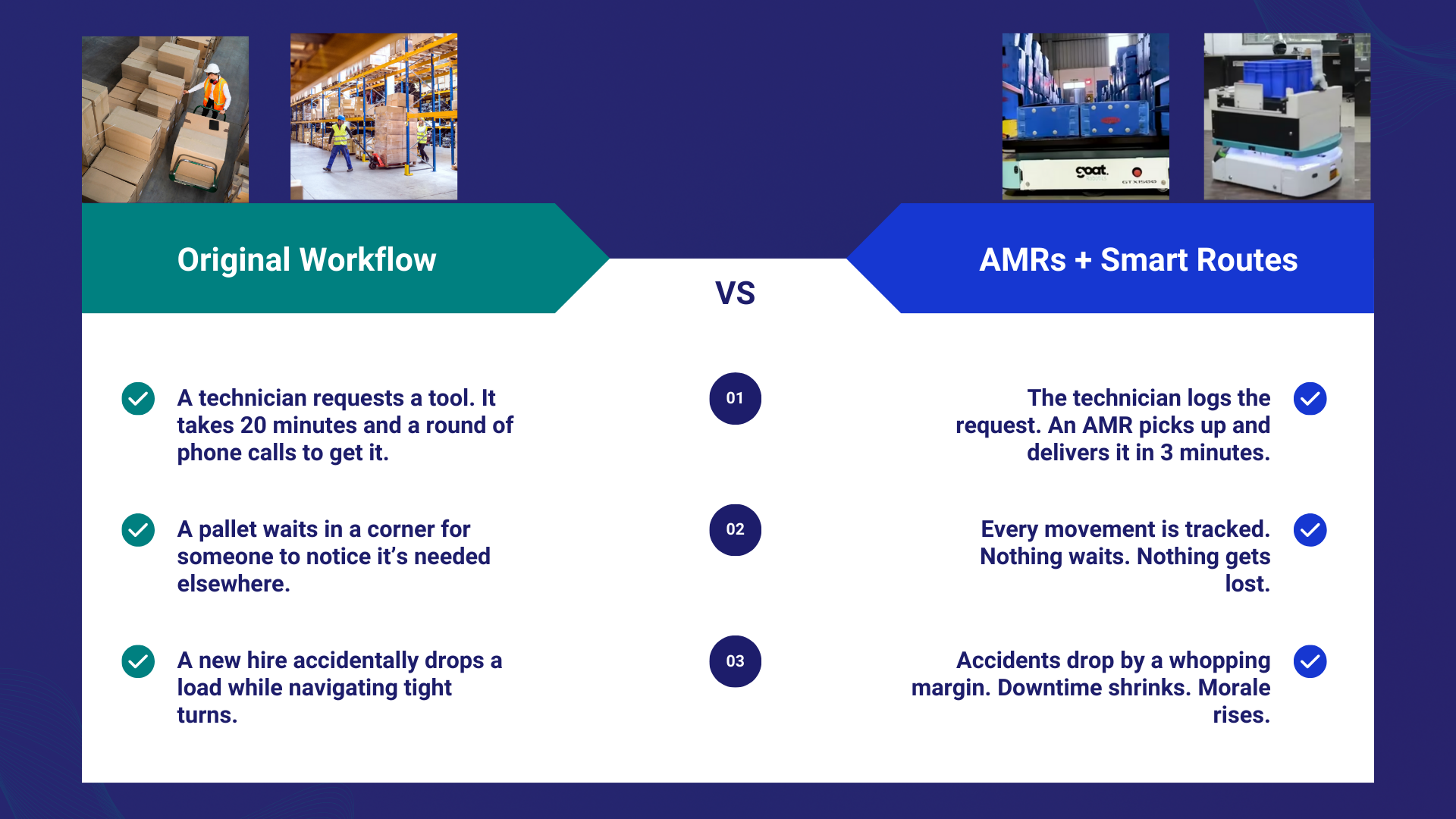 Figure 1. How AMRs+ Smart Routes Transform Logistics (source: Verdusco Automation).