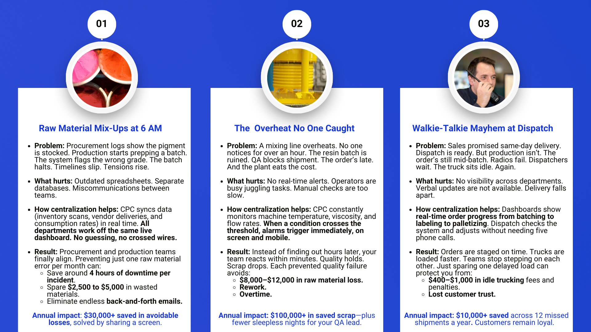Figure 1. Three Pain Points Solved with One Smart Solution: Centralized Process Control (source: Verdusco Automation).